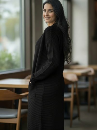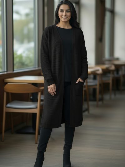 Womens Open Front Midi Longline Stretch Ribbed Cardigan With Pockets