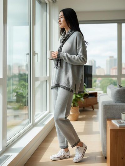 Stylish Soft Winter Co-Ord With Scarfs,Plus Sizes, Acylic,Knitted,2025, Womenswear Elegant Chic Love Outerwear