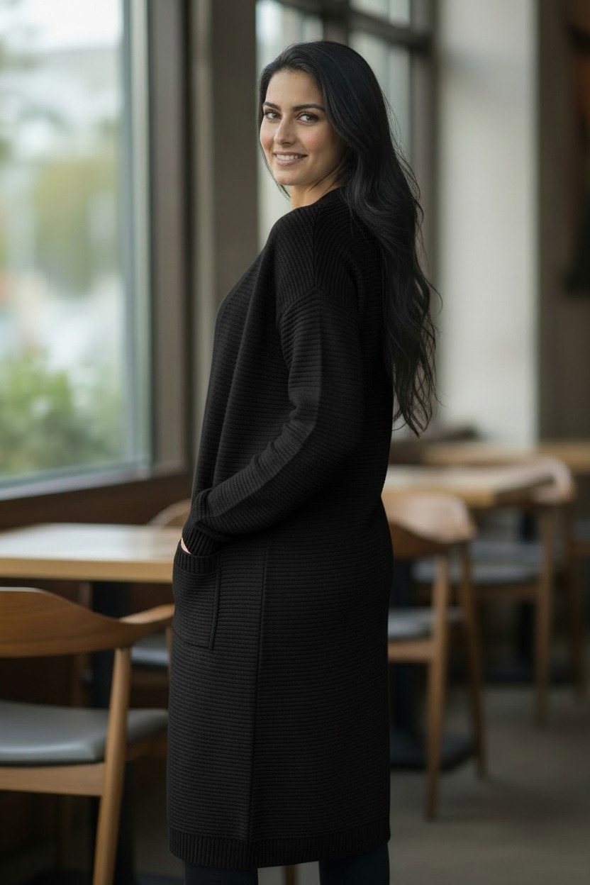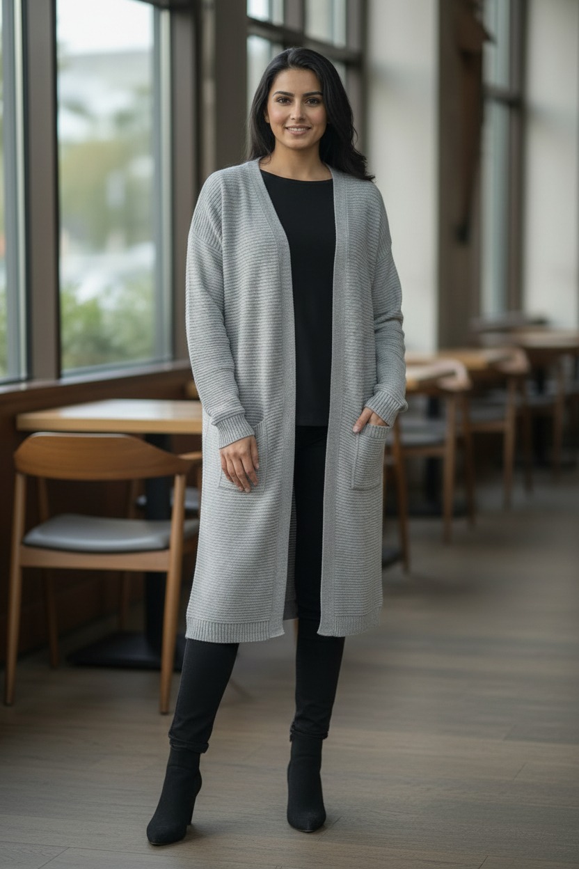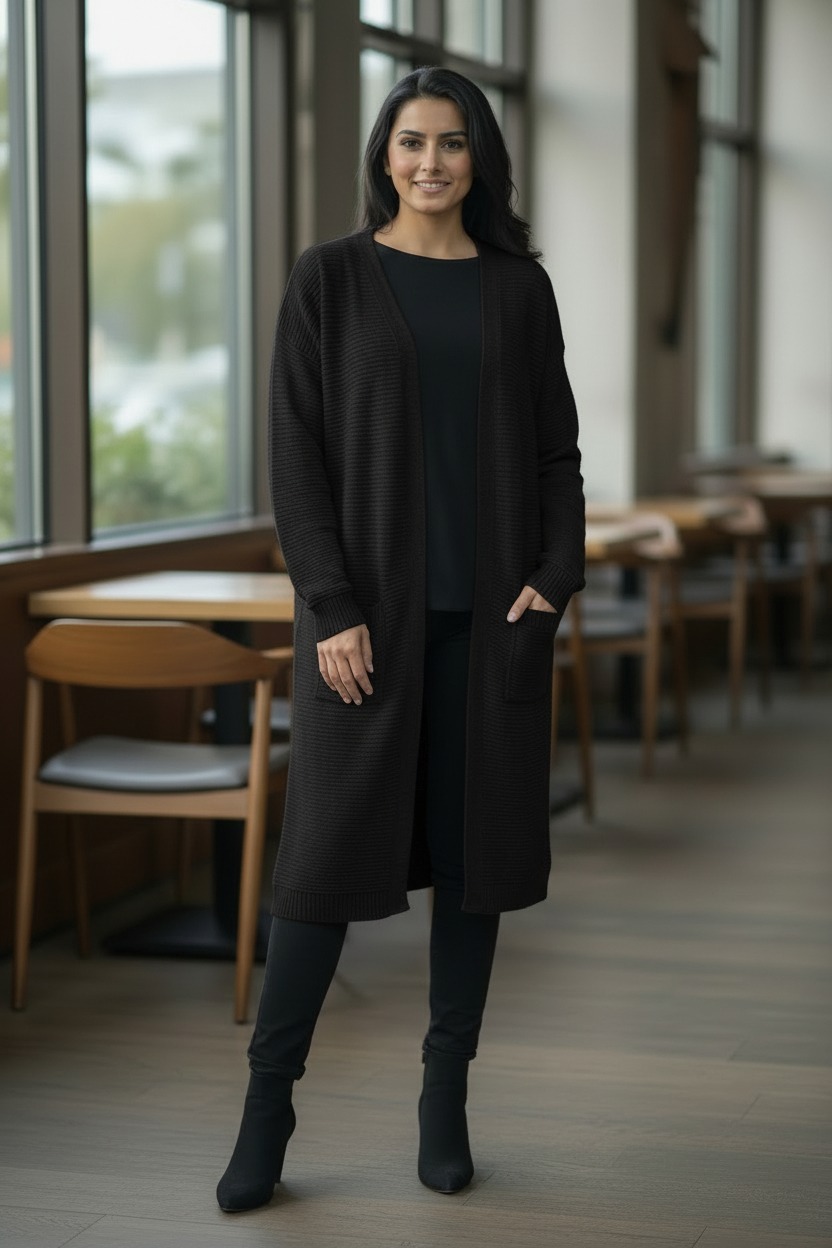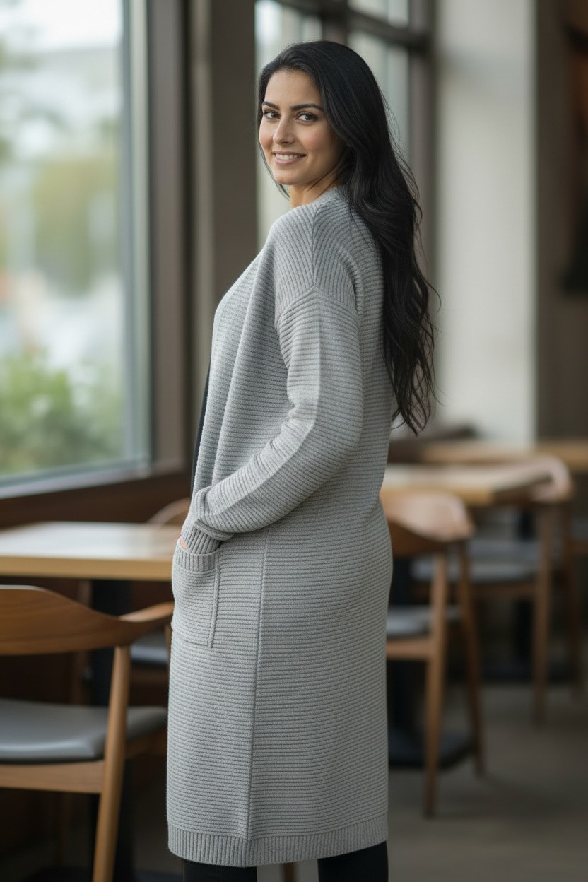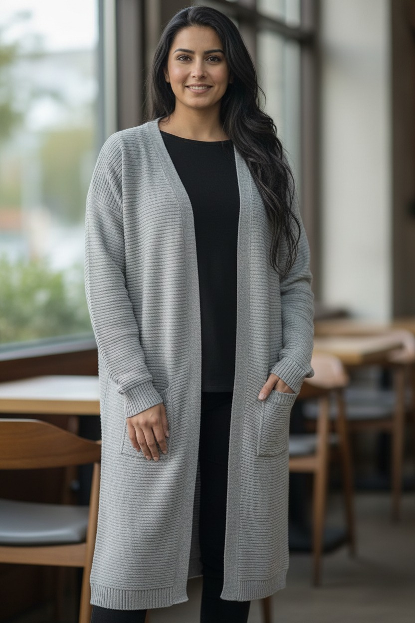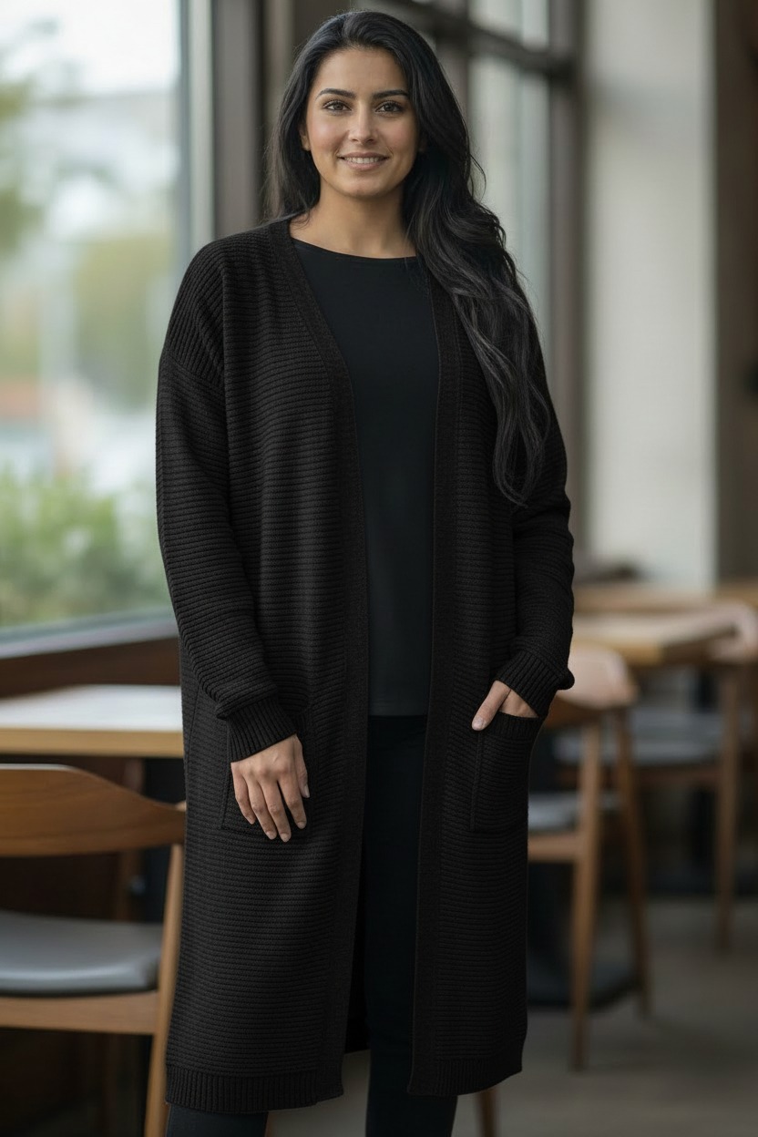 This versatile, longline cardigan is a wardrobe essential, perfect for layering over any outfit. Crafted in a cozy ribbed knit texture, it features a stylish open-front design and two practical front pockets.